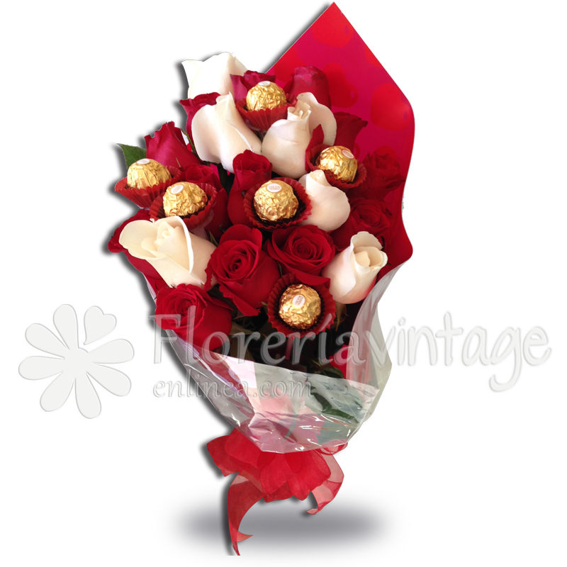 18 rosas y 6 chocolates Ferrero Rocher en bonito bouquet con papel decorado celofan y moño