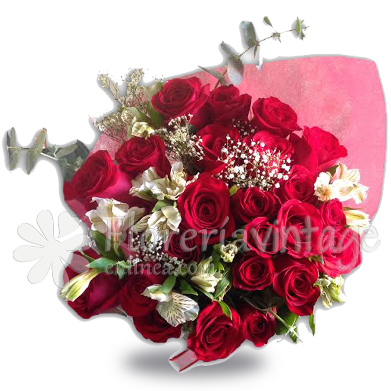 Hermoso bouquet con 24 rosas, alstromeria, minigipsophilia y follaje fino